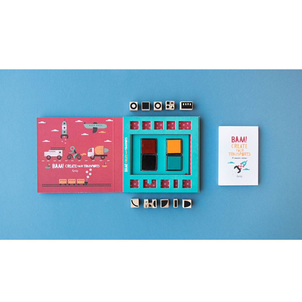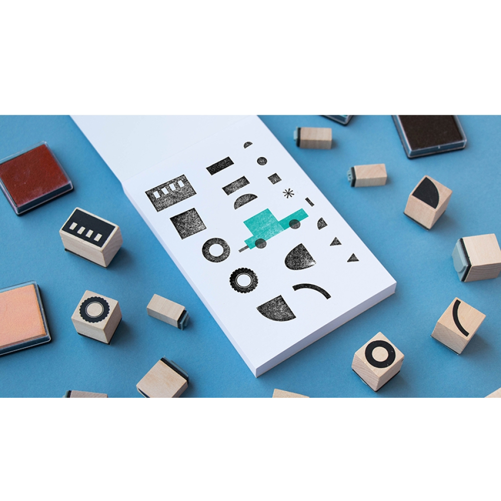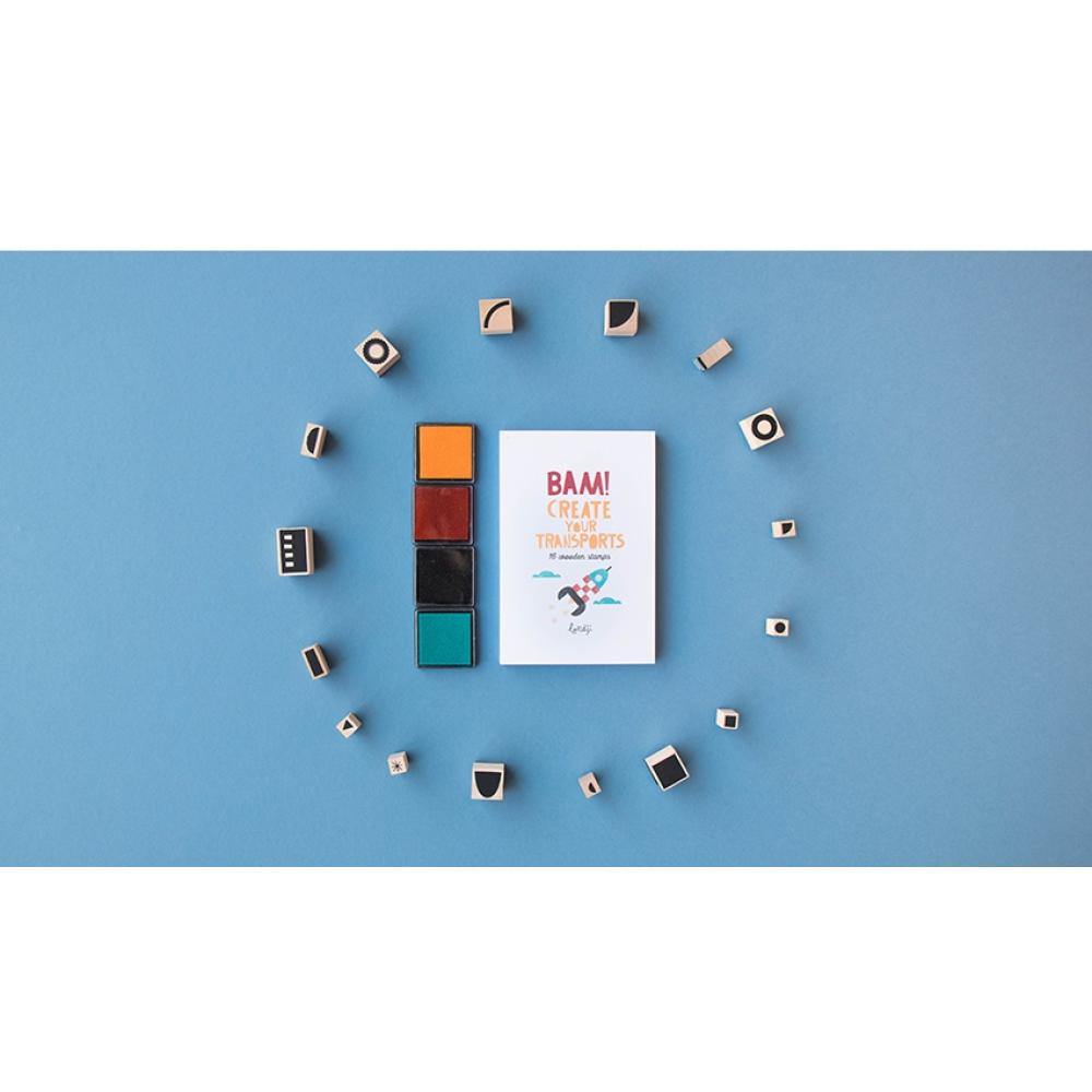 Met deze leuke stempels maak je zelf je eigen voertuigen. In de doos zitten 16 houten en rubberen stempels met afbeeldingen om je eigen creaties te maken. Wie maakt er een bus of een raket?