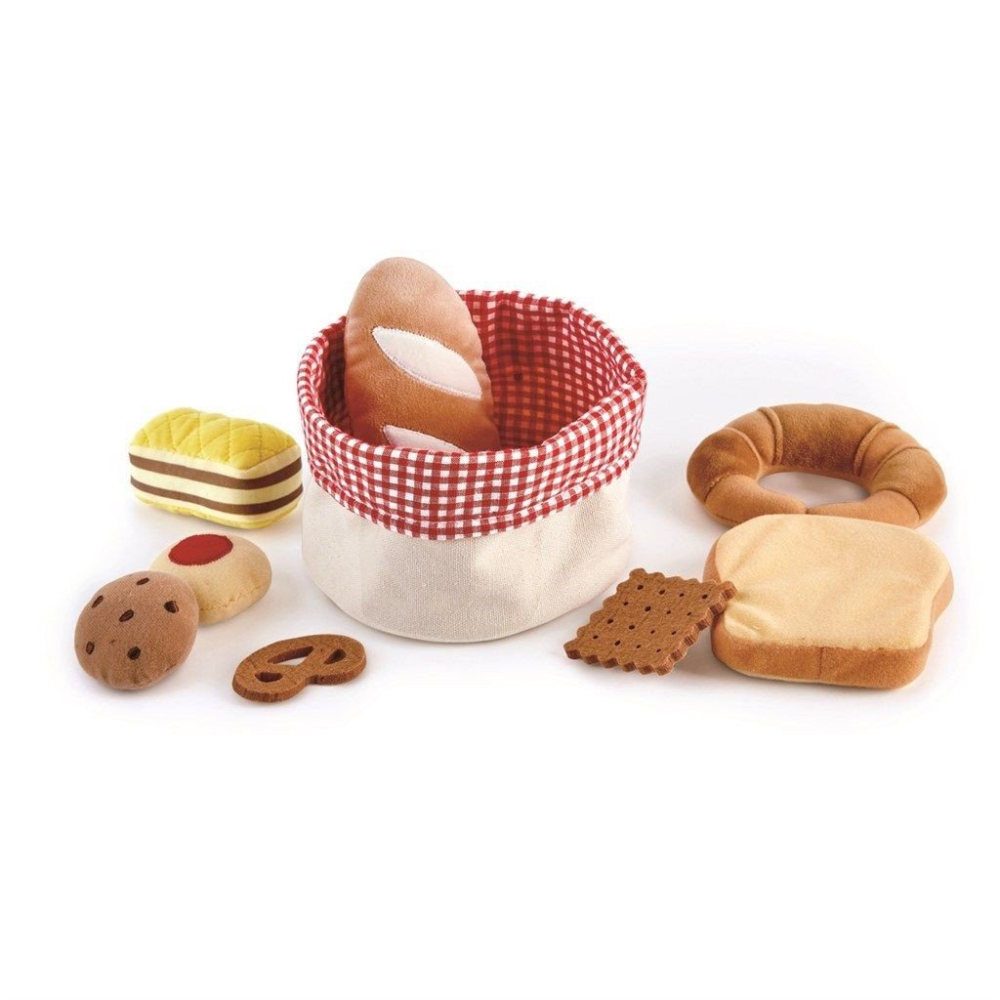 Vul je mandje met ene hele bakkerij met brood voor jou en je vriendjes! Er zit een sneetje geroosterd brood bij, een stokbrood, een croissant, een koekje met stukjes chocolade, een zandkoekje, een jamkoekje, een hartvorming boterkoekje en een stuk spekkoek. Gemaakt van vilt en stoffen met een zachte, realistische textuur.