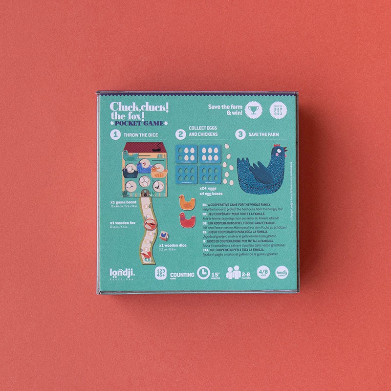 Red de eitjes en kippen uit de klauwen van de vos in dit leuke coöperatieve reisspel van Londji. In Cluck, Cluck! The Fox! werken kinderen samen en maken ze slimme keuzes op basis van de dobbelsteen om hun doel te bereiken. Dit compacte spel in pocketformaat is ideaal om overal mee naartoe te nemen en laat jonge kinderen op een speelse manier kennismaken met cijfers en de basis van coöperatief spelen. Geschikt vanaf 4 jaar en gemaakt van FSC-papier en gerecycleerd karton.