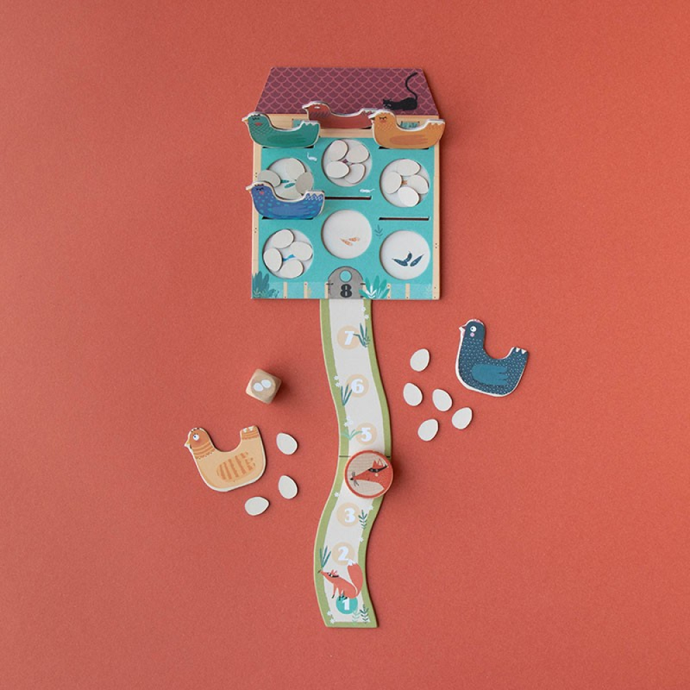 Red de eitjes en kippen uit de klauwen van de vos in dit leuke coöperatieve reisspel van Londji. In Cluck, Cluck! The Fox! werken kinderen samen en maken ze slimme keuzes op basis van de dobbelsteen om hun doel te bereiken. Dit compacte spel in pocketformaat is ideaal om overal mee naartoe te nemen en laat jonge kinderen op een speelse manier kennismaken met cijfers en de basis van coöperatief spelen. Geschikt vanaf 4 jaar en gemaakt van FSC-papier en gerecycleerd karton.