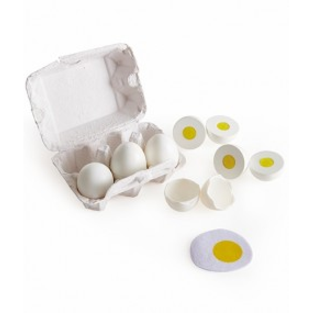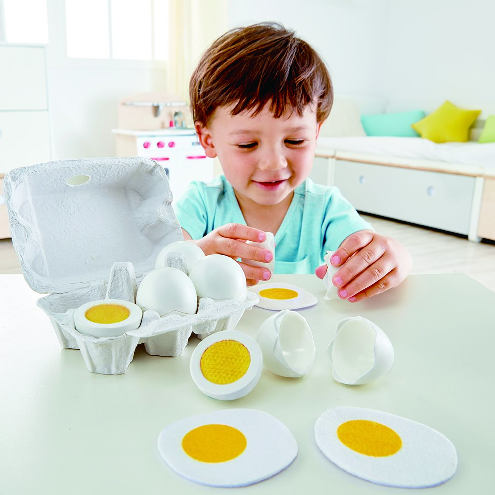 Het is tijd voor het ontbijt! Hoe wil jij je eieren? In deze eierdoos zitten zes eieren: drie hardgekookt en drie gebakken. Je kunt de dop eraf halen om het spel nog echter te maken.