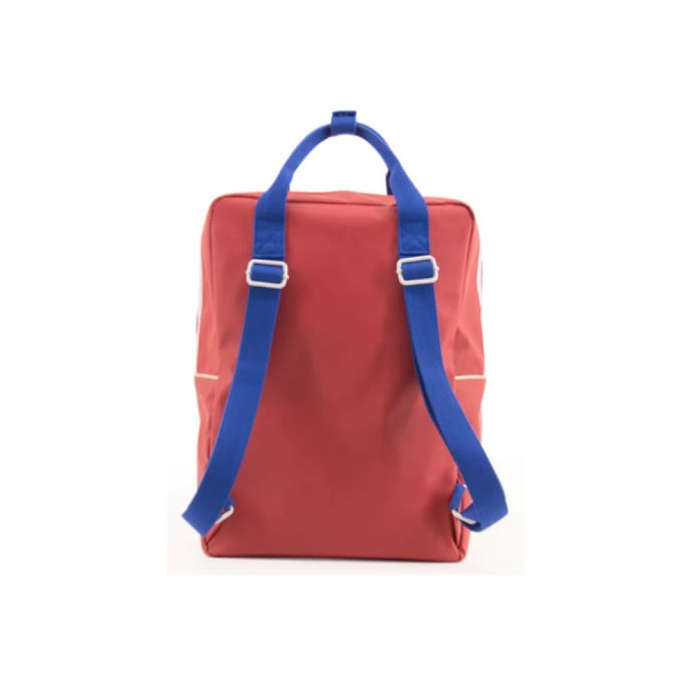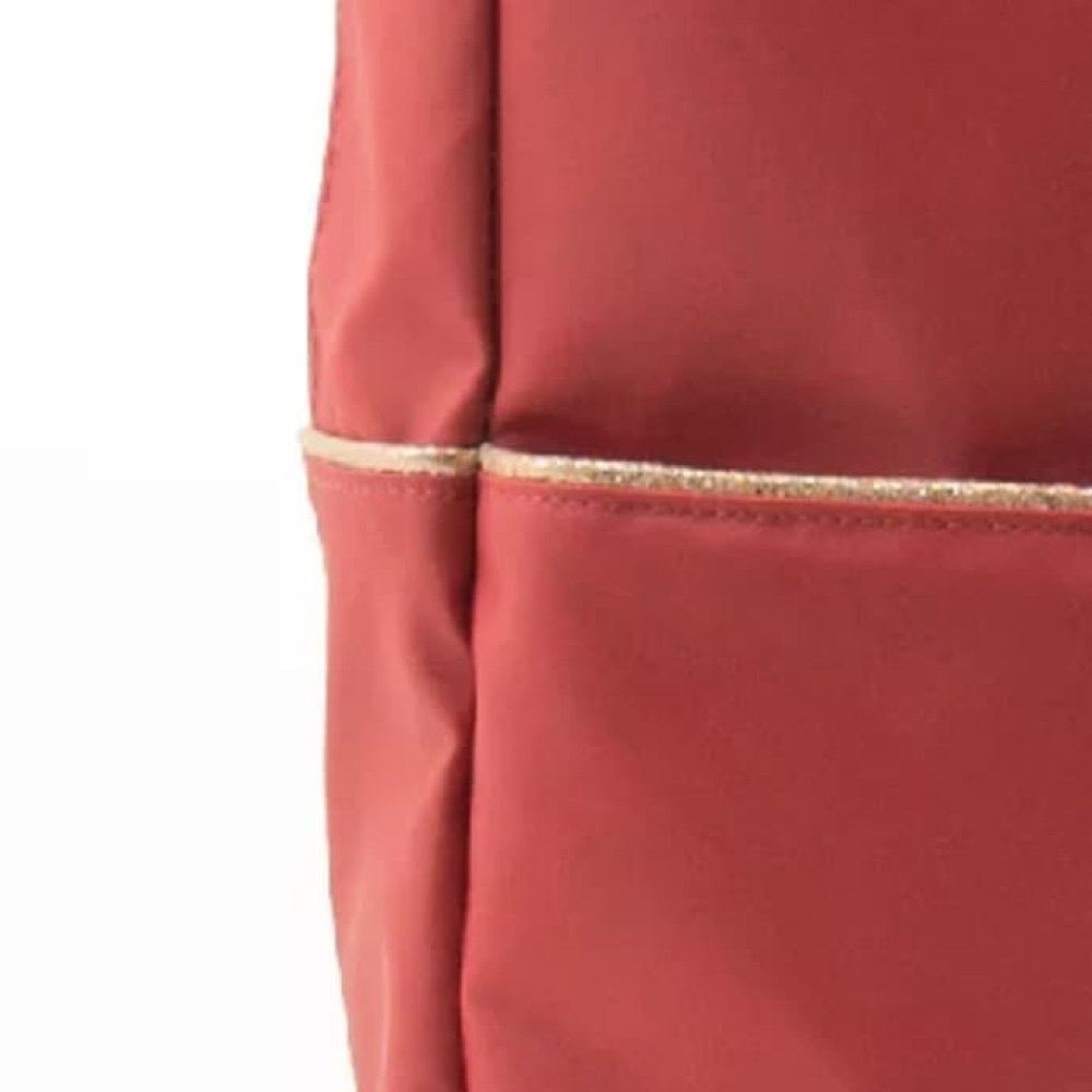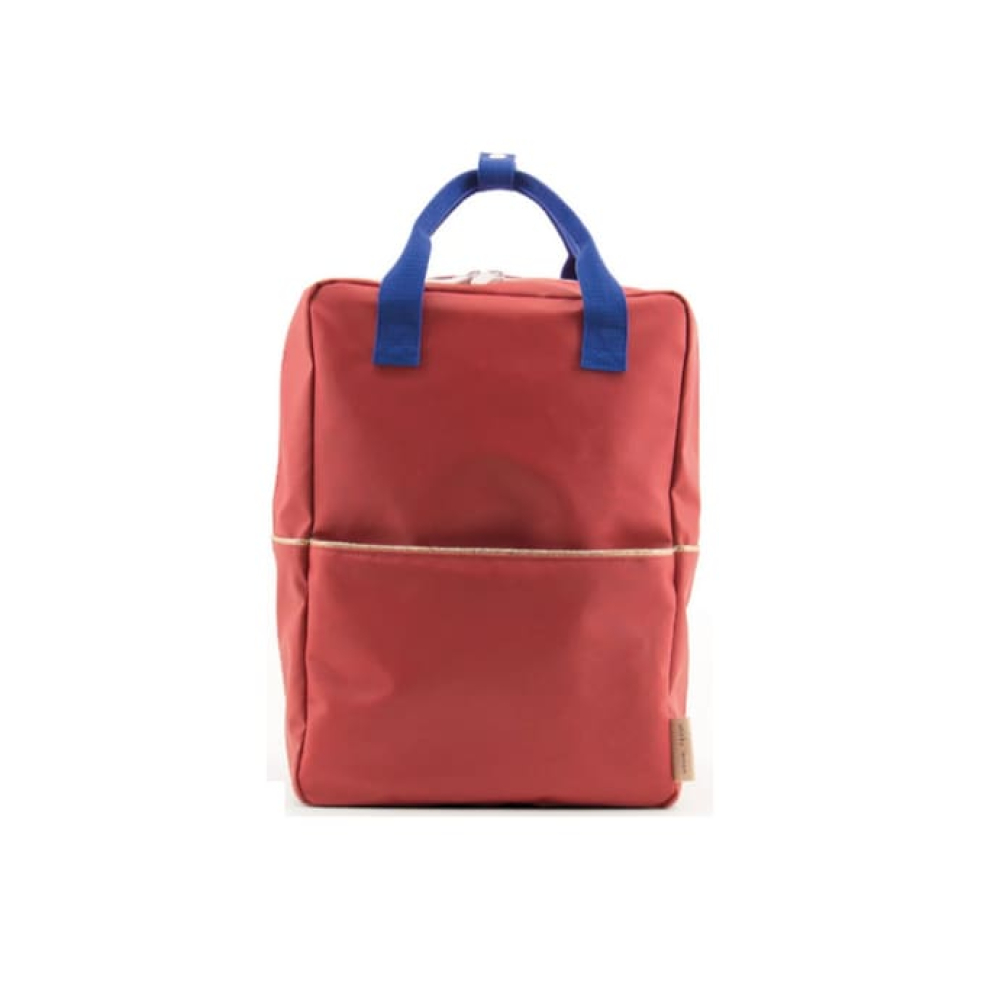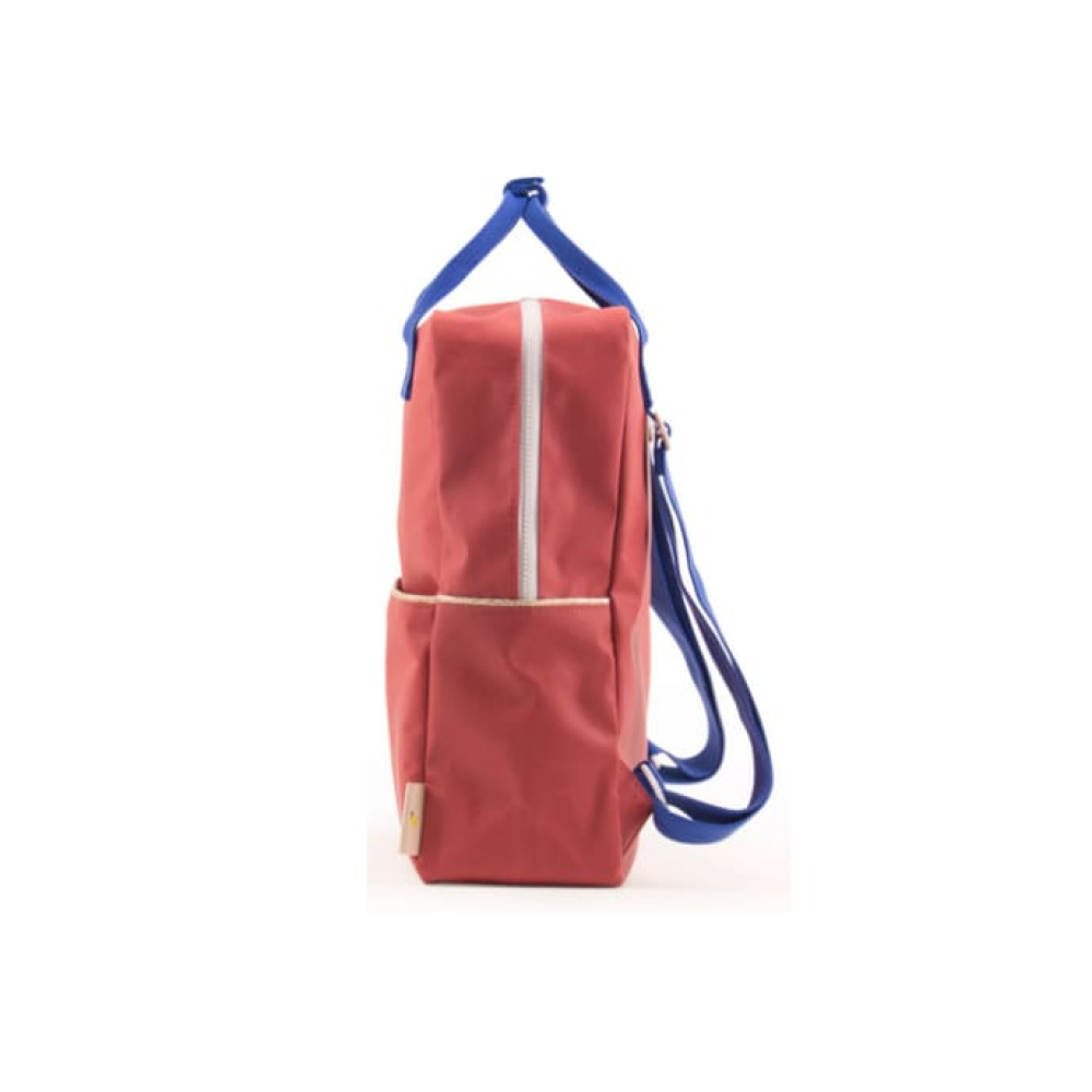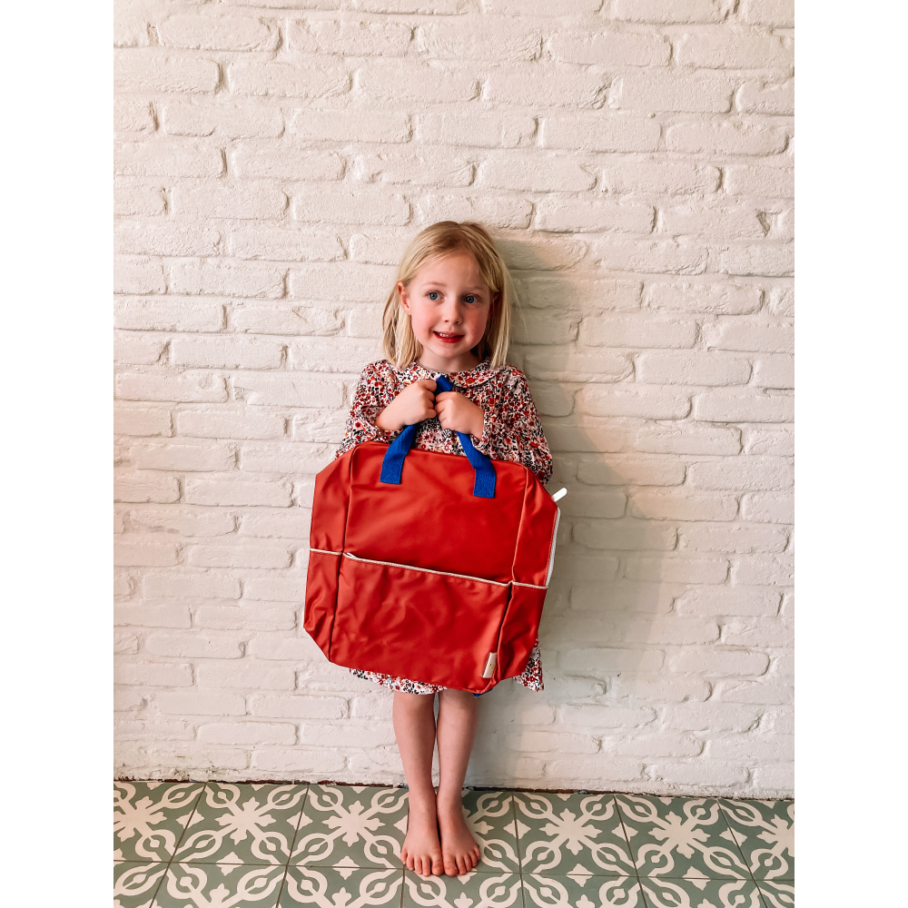Een grote rugzak in roestig rood met inktblauwe handvatten met een sprankelende glittertoets. De rugzak heeft verstelbare schouderhandvatten. De rugzak is gemaakt van gecoat nylon, de voering is waterdicht en de ritsen zijn wit. Aan de binnenkant vind je een groot binnenvak, een kleiner binnenvakje en een klein vakje met rits vooraan.