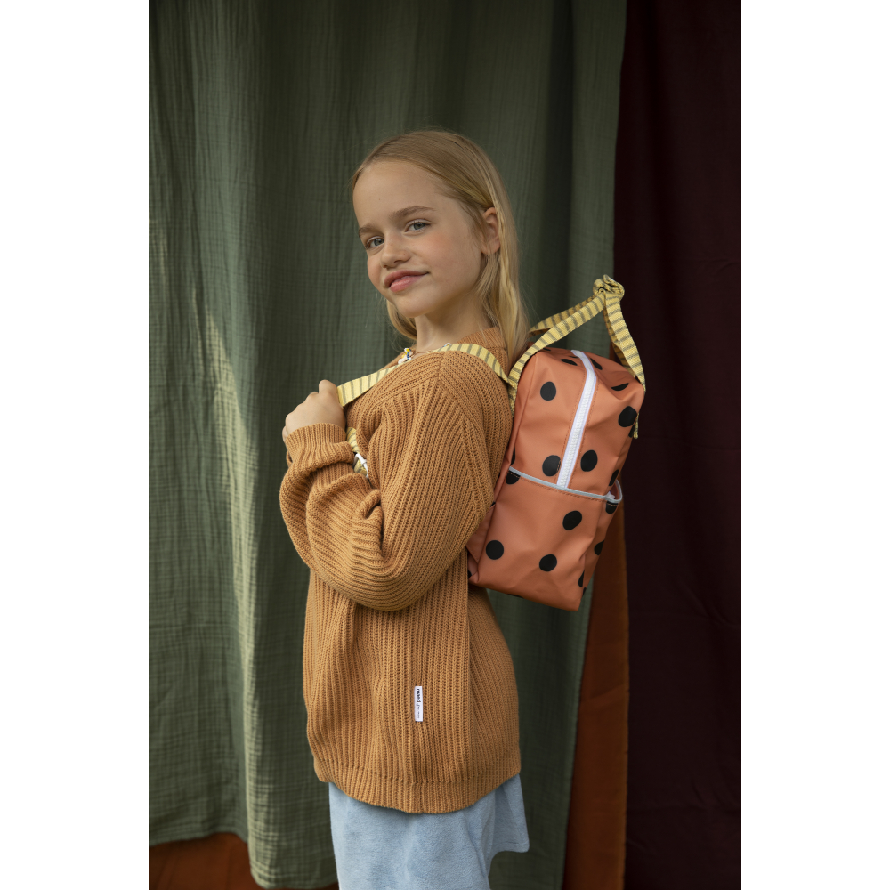 Een vervaagde oranje kleinere rugzak met bollen, ideaal voor de kleuterklas. Vooraan is een extra vakje. De rugzak is gemaakt van gerecycleerde PET-flessen en is waterdicht. Aan de binnenkant is er een groot vak en een handige flessenhouder met elastiek.