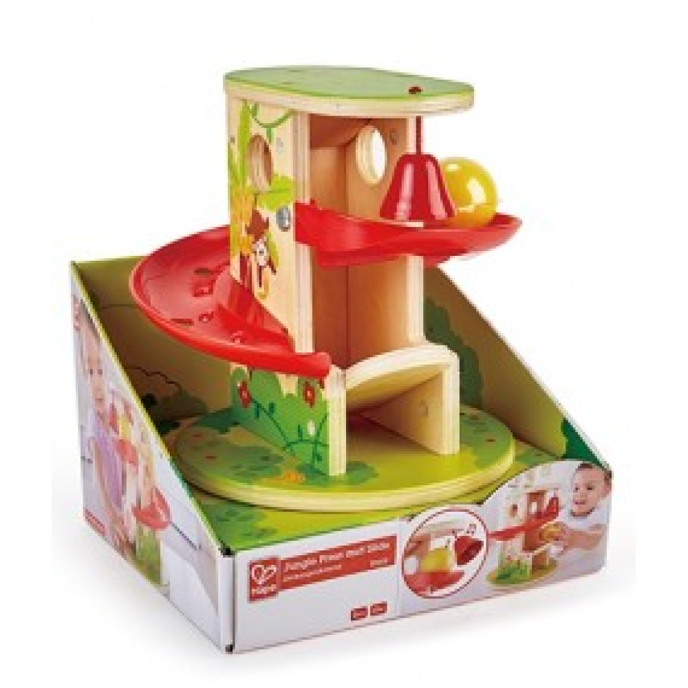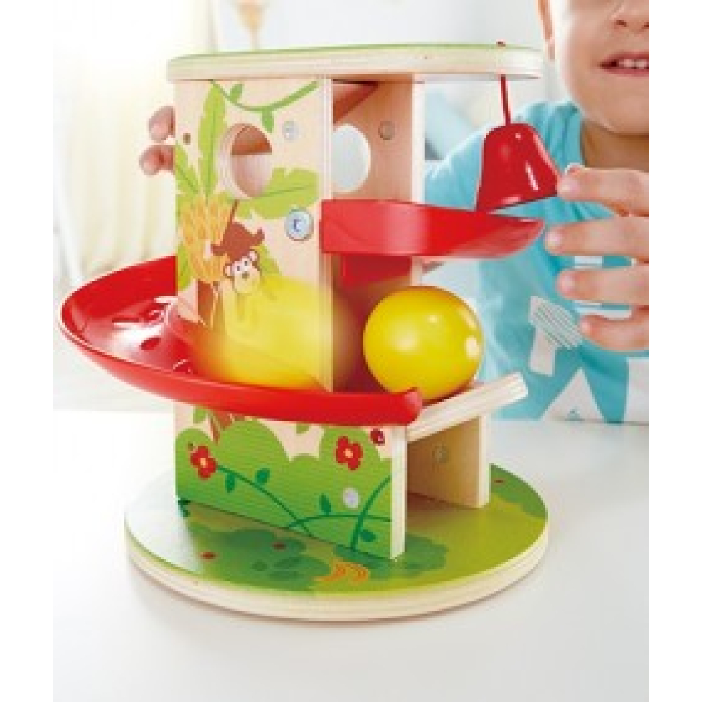 Glijden is leuk! Laat de houten bal rond de boom naar de junglebodem racen. Druk vervolgens op de hendel om helemaal opnieuw te beginnen!