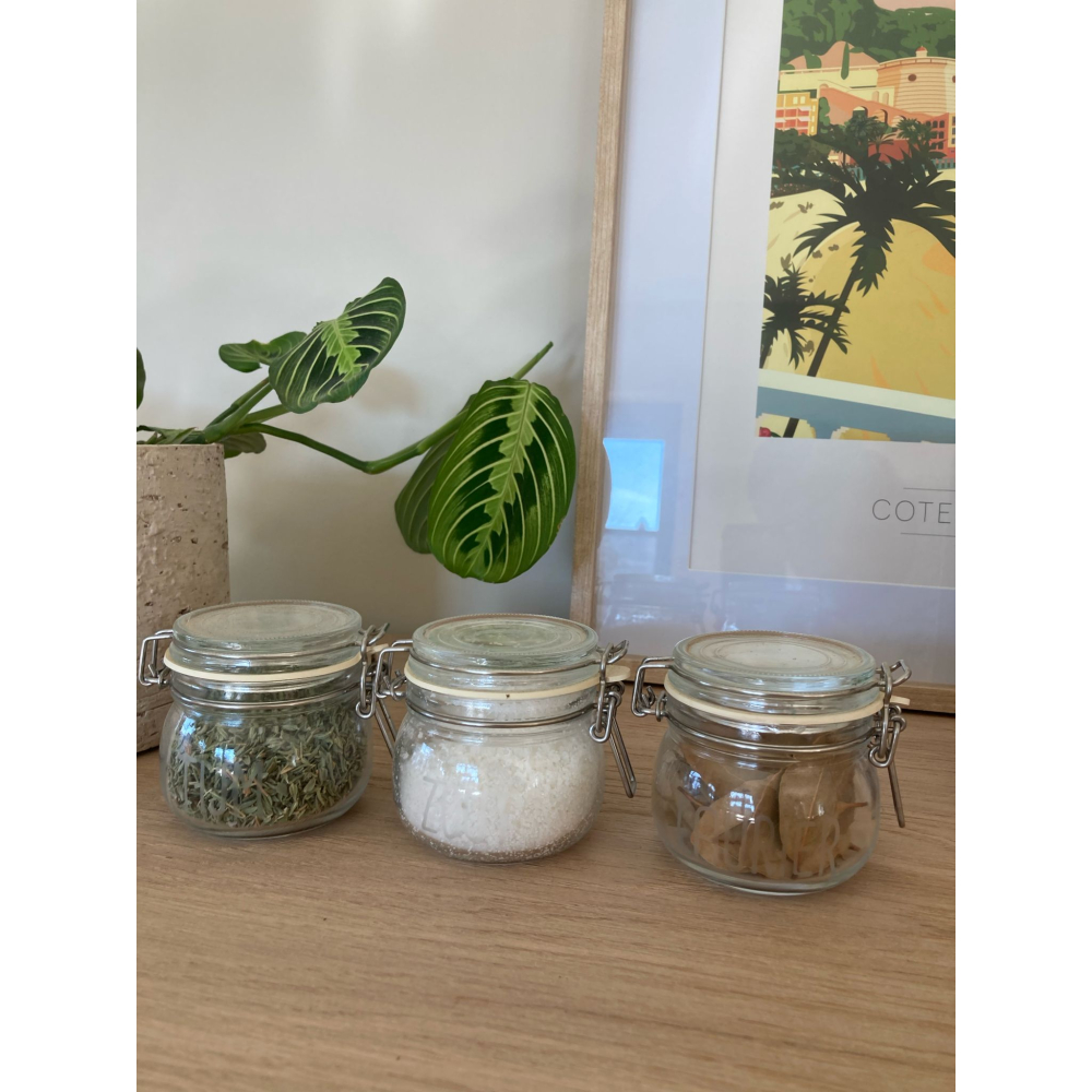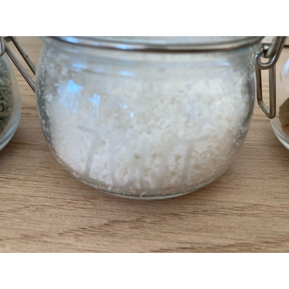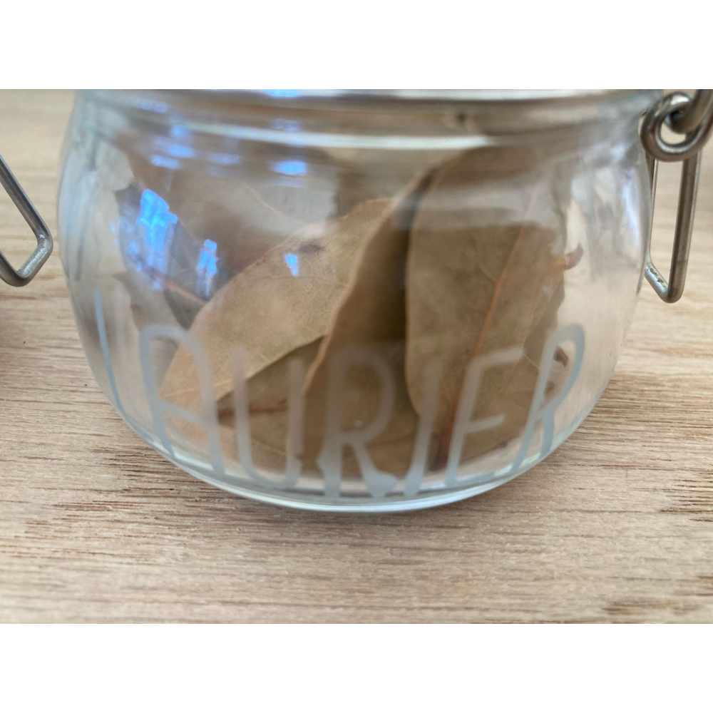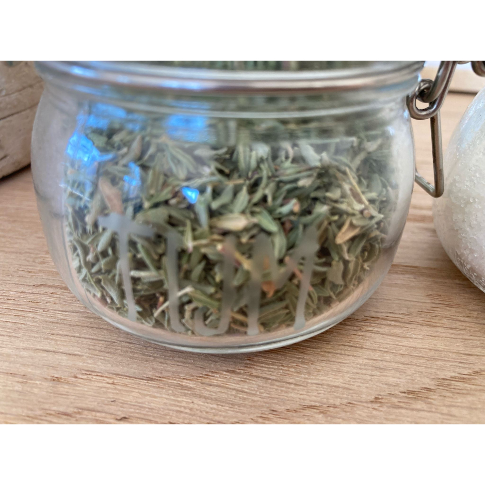 Kruidenpotjes met verschillende opschriften: tijm, laurien en zout