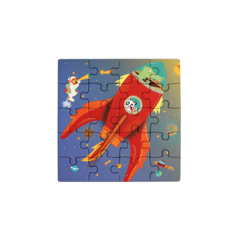 Deze mooie ruimtepuzzel is ideaal voor onderweg. Het uitklapboek bestaat uit 2 puzzels van 20 stukjes. Ideaal om te puzzelen in de auto, op restaurant of in het park. De puzelstukken blijven aan het boek vastkleven, dus minder kans om puzzelstukjes kwijt te spelen.