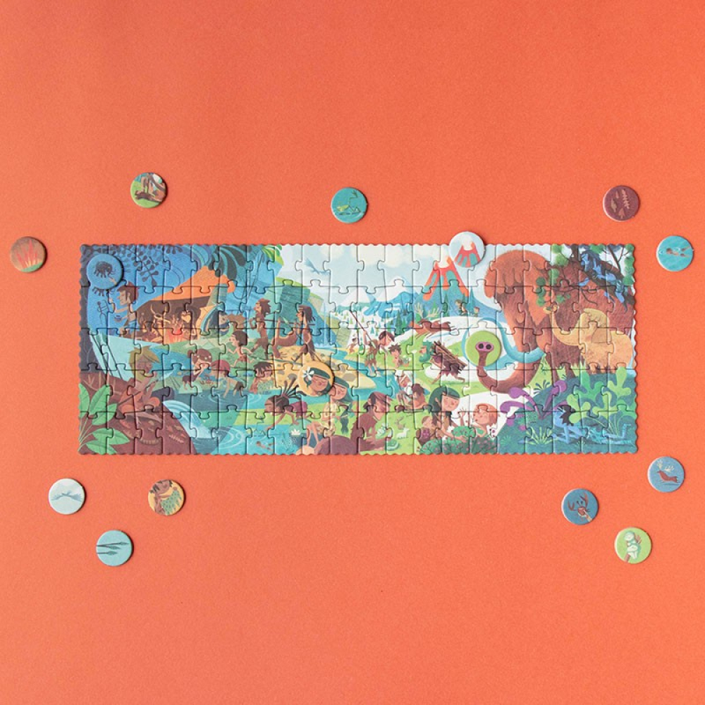 Ontdek het leven in de prehistorie met deze kleurrijke pocketpuzzel van Londji. Leg de 100 stukjes om een levendige scène uit het Paleolithicum te onthullen, en gebruik vervolgens de 16 observatiekaarten om fascinerende details te ontdekken: hoe mensen vuur maakten, op mammoeten jaagden en de eerste grotschilderingen creëerden.
