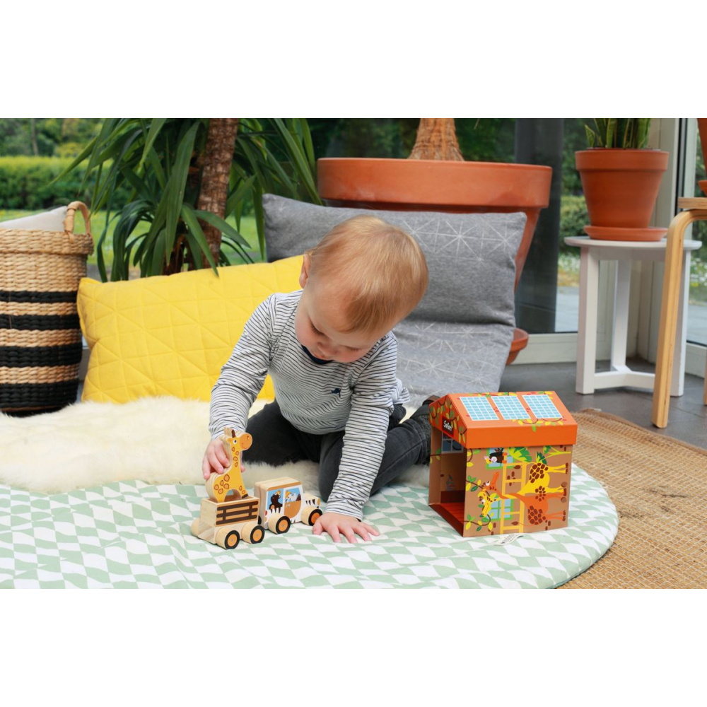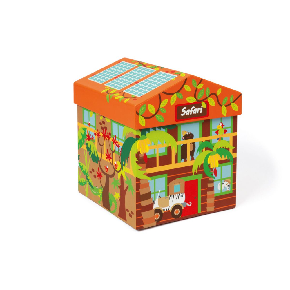 Op de safari beleven de krokodil, de aap, de neushoorn en de giraf de dolste avonturen. De doos wordt een speelhuisje, handig om je speelgoed nadien mooi terug op te bergen. De doos is van stevig karton, er zijn 4 houten figuren, wagen en aanhanger (magnetisch) inbegrepen.