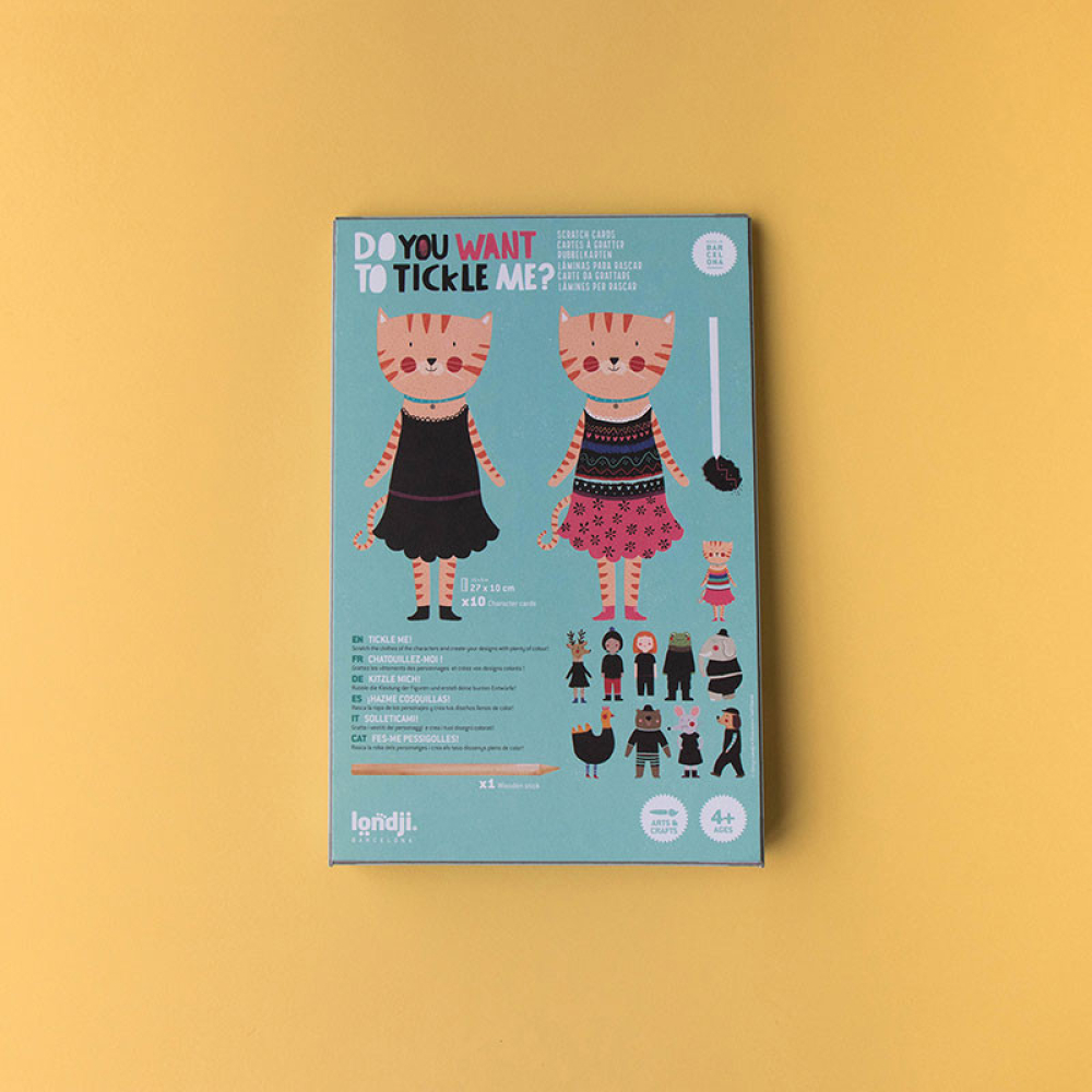 Tickle me is een leuke activiteit van Londji. Teken op de jurken van de personages en maak zelf jouw mooiste kleurrijke ontwerpen. Je doet dit door de zwarte laag weg te krassen, zo verschijnen er mooie kleuren. Het is een fantasierijke activiteit met ene verrassend mooi resultaat.