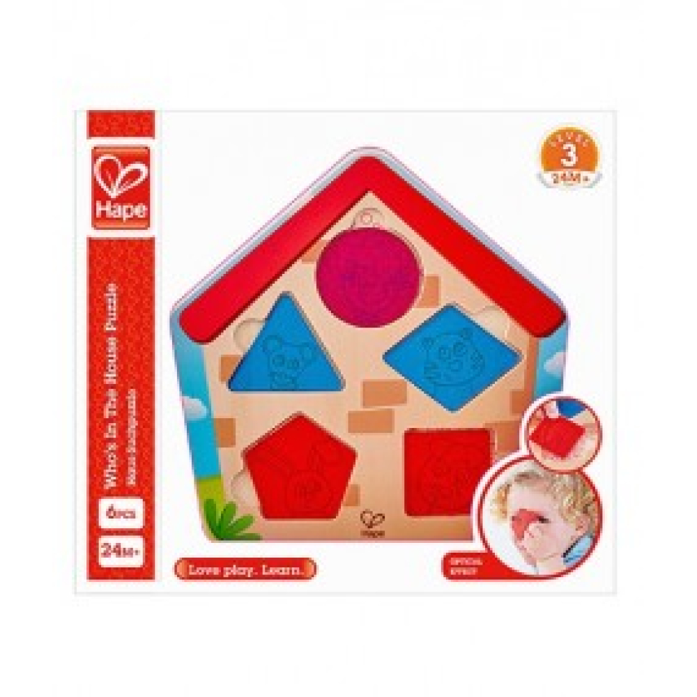 - Deze wie-is-er-in-het-huis puzzel bevat een houten huisvormige basis met vijf geometrische, fel gekleurde raamdelen.